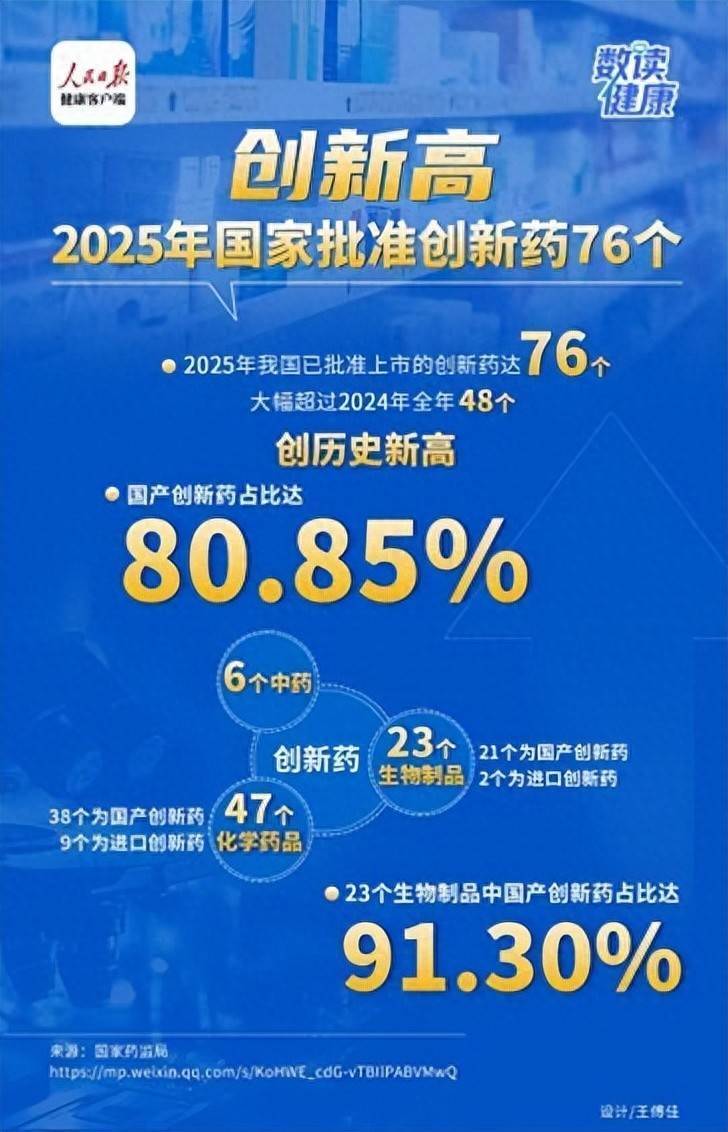 国家药品监督管理局数据显示,2025年我国批准上市创新药达76个,创历史新高。47个化学药品中,38个为国产创新药,9个为进口创新药,国产创新药占比达80.85%;23个生物制品中,21个为国产创新药,2个为进口创新药,国产创新药占比达91.30%。国产创新药已经成为创新药上市的主体力量。与此同时,2025年中国创新药对外授权交易(BD)金额首次突破1300亿美元,创下全球医药产业重要纪录。