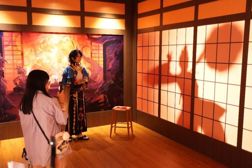 顺着动线一路行进,便会来到 1:1 还原 CG 画面的猫川庭院。经过散发着淡淡“班味”的猫老板,可以看到左侧晃动的式神剪影。部分玩家和我一样,还以为这是电子投影,直到现场有人呼喊式神的名字,而“投影”对此作出回应时,才发现屏风后面竟然是真人 Coser 在进行演出。不得不说,这个惊喜的彩蛋,也让玩家感受到了官方对线下活动的用心。
