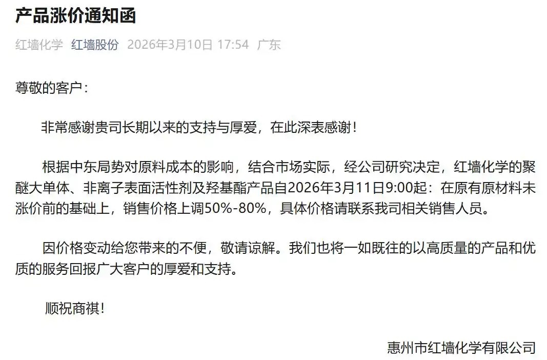 3月10日,红墙股份(002809)发布产品涨价通知函。根据中东局势对原料成本的影响,结合市场实际,经公司研究决定,红墙化学的聚醚大单体、非离子表面活性剂及羟基酯产品自2026年3月11日9:00起:在原有原材料未涨价前的基础上,销售价格上调50%-80%。